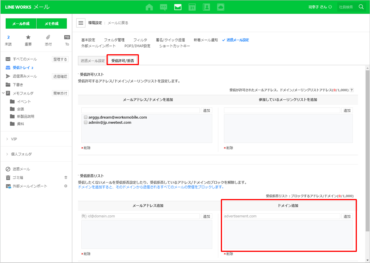 ドメイン名で受信拒否すると、そのドメインから受信するメールはすべてブロックされるため、設定は慎重に行ってください。- [ポイント]