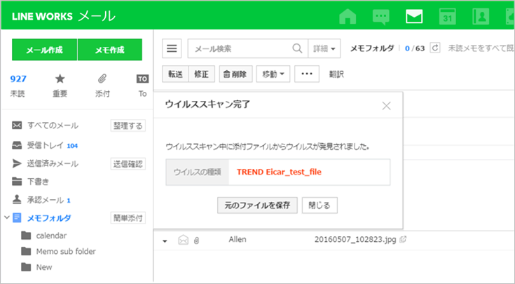 取引先や知り合いから送られてきたメールでも、マルウェアに感染している場合はサーバーが自動的に検知してブロックするため、安心してメールを使用できます。また、LINE WORKSからマルウェアが添付されたメールを送信しようとした際には、下図のように安全ではないファイルが添付されて送信失敗したという案内メールが送信者に送られ、問題状況を認識することができます。添付ファイルを削除すると、メールは正常に送信されます。