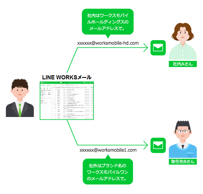 「外部メールインポート」機能を使うと、複数のメールサービスをLINE WORKSで一元管理することができます。社外向けのメールアドレスと、社内用のメールアドレスが違う場合などにも便利です。業務のヒストリーが複数のメールアドレスに分かれて保管されている場合も、各メールサービスを切り替えて確認する必要がなく、LINE WORKSですべてのメールを確認することができます。