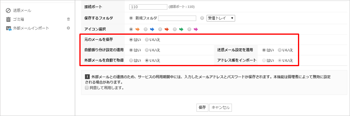 外部サービスから取得したメールを保存するフォルダを選択し、「詳細設定」の内容を確認して注意事項を読んで同意にチェックを入れ[保存]をクリックします。