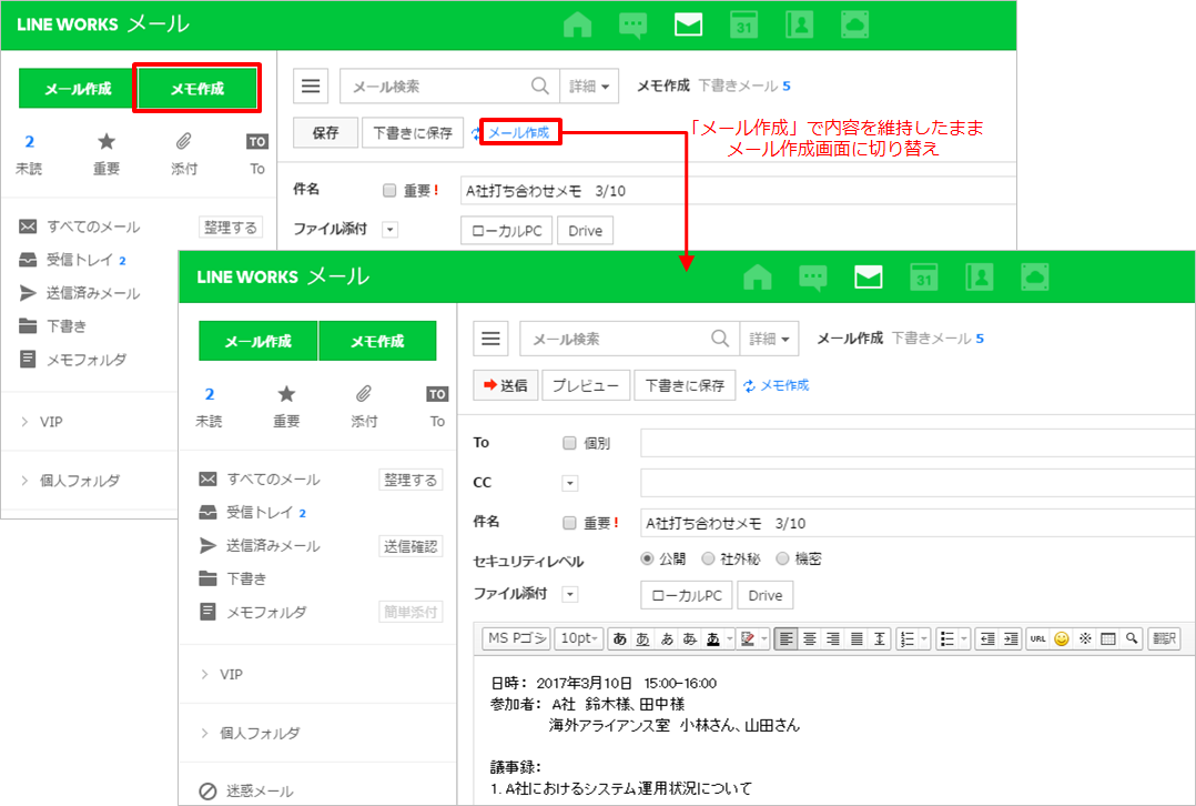LINE WORKSメールは、メモ作成とメール作成を簡単に切り替えることができます。