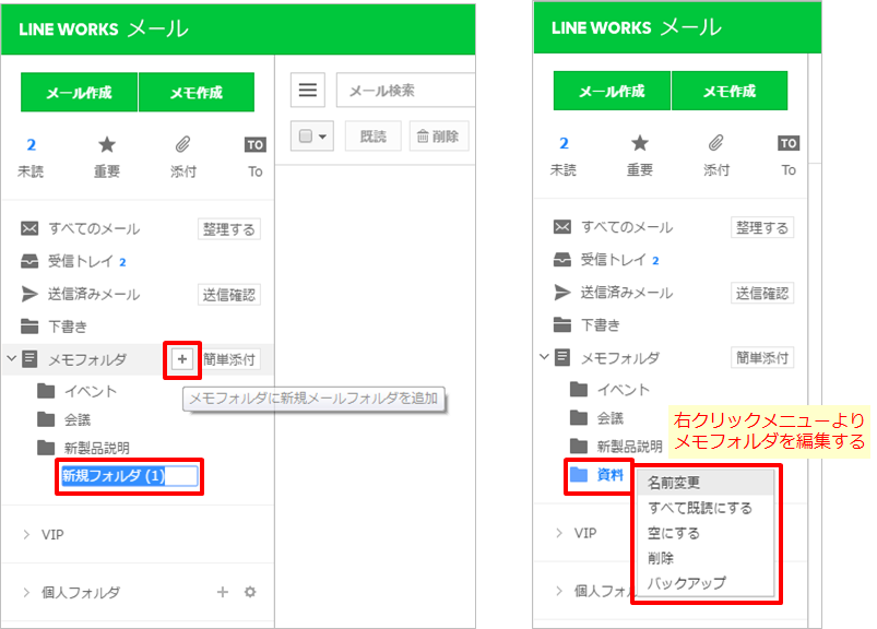 - サブフォルダ作成および[簡単添付]機能はPC Webでのみ可能です。