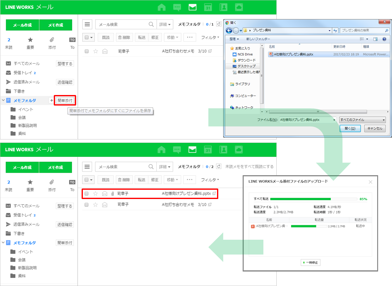 ファイルの[簡単添付]機能を使えば、メモにファイルを保存する際に件名や本文の入力は不要です。作成画面を開かなくても、メール画面からすぐにファイルを添付したメモを作成できます(ファイル名がメモの件名になります)。