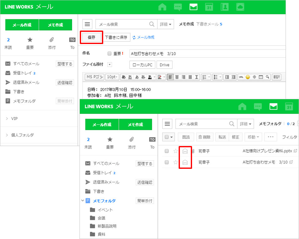 良いアイデアを思い付いたときや、ミーティングの議事録、また重要なファイルの保存に、LINE WORKSメールのメモ機能を活用してみましょう。保存したメモは、会社のパソコンやスマホでメールのメニューからいつでも確認・修正し最新の状態に保つことができます。