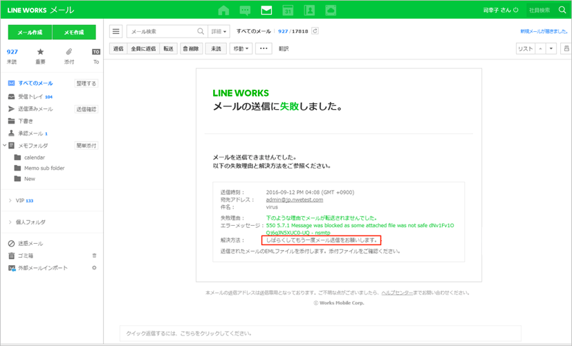 Guide LINE WORKS関連の様々なタイプの問い合わせをこちらで行うことができます。 ブログ 管理 メール トーク Drive アンケート カレンダー もっと見る アドレス帳 グループ はじめて ホーム Menu ブログ 管理 メール トーク Drive アンケート カレンダー もっと見る アドレス帳 グループ はじめて ホーム security セキュリティ メール 受信ゲートウェイの設定 受信ゲートウェイとは、メールがLINE WORKSに到達する前に通過する外部サーバーのことです。 受信ゲートウェイには、迷惑メールのフィルタリング処理をしたり、 2017.09.05 管理 LINE WORKSにおける個人情報保護とセキュリティ認証への対応について LINE WORKSは、国際的なセキュリティ標準である SOC2/SOC3 および ISO27001、ISO27017、 ISO27018認証を取得しており、プ 2016.10.31 メール 重要な情報もセキュリティレベル機能を利用してメールで安全にやり取りする LINE WORKSメールのセキュリティレベル設定を使いこなして、重要な情報を安全にメールでやり取りします。 「機密情報が外部に漏れないか心配。。 2016.10.17 メール 受け取りたくない迷惑メールを確実にブロックする方法 受信してしまった迷惑メールを報告し、迷惑メールブロックの精度を上げて快適なメール環境を作りましょう。 メールサーバーを運用しているが、自社で迷惑メール対策をする 2016.10.06 メール 迷惑メール対策 迷惑メール対策、ウイルスメール対策に気をとられることなく、安心してメールを使うことができます。 受信した迷惑メールの分類に時間をとられていませんか 2016.09.24 管理 顧客情報や機密情報を、スマホの紛失や盗難から守る!MDMで端末をリモートコントロールする方法 オフィスの外にいるときや、移動中にもモバイル端末で仕事ができると、スキマ時間を利用して仕事を進めることができ、とても効率的に働くことができます。一方で、情報シス 2016.09.17 管理 特定のネットワークからの接続のみを許可 [接続制限] 機能を使うと、会社や店舗などで利用するネットワークのIPアドレス範囲を指定することで、特定のネットワーク外からLINE WORKSサービスを利用で 2016.09.15 Drive 社内・社外とのファイル共有を「リンク共有」で安全・手軽に行う方法 ビジネス文書のファイルやデータ共有方法について、このような課題をお持ちではありませんか? 営業や研修で外出中の社員にメールで資料を送っている。 チームで共有して 2016.09.06 管理 スマホへのファイルの保存を制限してセキュリティを強化する スマホ利用時のファル保存を制限してセキュリティリスクに備える! スマホを業務で活用することができれば、会社の外でも、移動中でも、隙間時間にコミュニ 2016.09.02 もっと見る 9 10