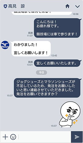 陸上競技を担当する営業部門はトップ選手と当社の製品の契約を結んでおり、常に営業担当がきめ細やかなサポートを行っています。そのため選手とのやりとりが特に多く発生する部署なのですが、選手とのコンタクトにLINE WORKSが活躍しているようです。外出の多い社員間のやりとりにも活用されています。