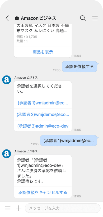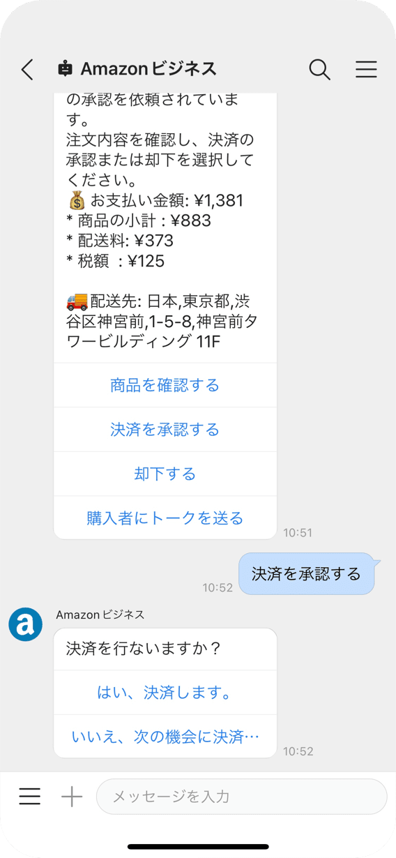 承認者が注文を確定すると、AmazonビジネスBotが購買内容を注文者、承認者の両方にお知らせ。