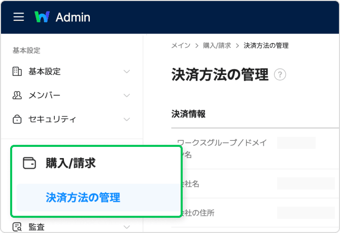 ヘルプセンターの決済方法管理ページを参考に、事前に管理者画面のメニュー「購入/請求」内の「決済方法の管理」から決済情報と決済方法をご入力ください。