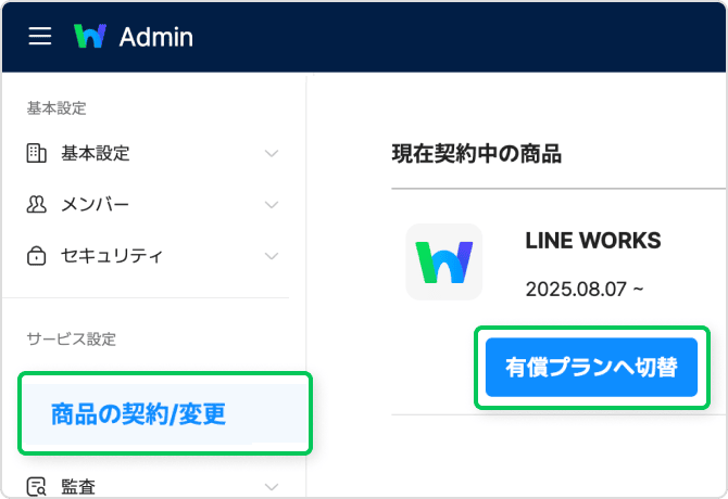 管理者画面のメニュー「購入/請求」>「商品の契約/変更」を選択したら下へスクロールします。現在契約中の商品のLINE WORKSの横にある「有償プランへ切替」をクリックします。