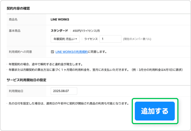 契約内容を確認して、「追加する」をクリックすれば、アップグレード完了です。