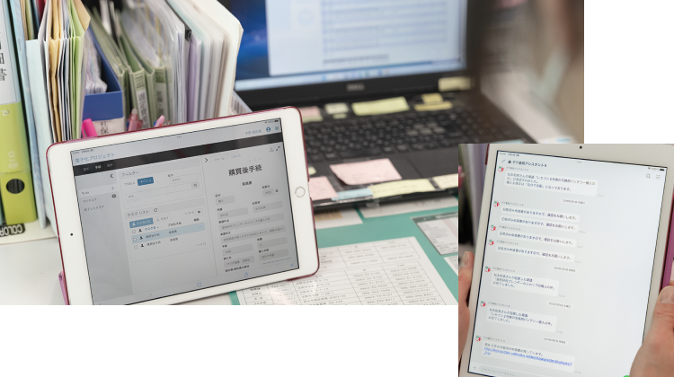 そこで、自治体に非対面のコミュニケーション目的で使用しても問題がないことを確認の上、その補助金を原資に、全社員にLINE WORKSおよびiPadの導入を決定しました。また、両者の導入を機に、申請・承認業務の電子化を行う社内システムの構築も行い、業務改善を推し進めることにしました。
