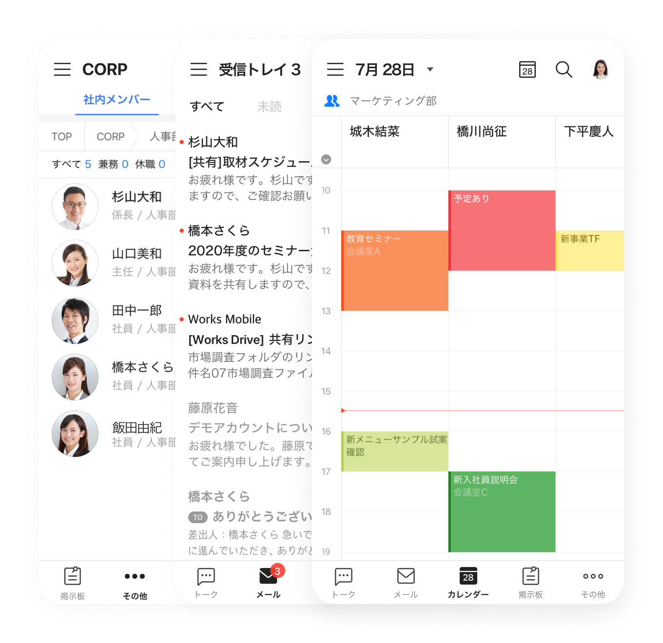 詳しくはこちら1つのアプリに トークやメール、アドレス帳のほかにも、社内周知ができる掲示板や、メンバー予定も把握できるカレンダー、資料等をどこからでも