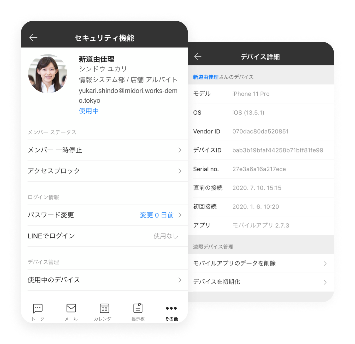 メンバー管理機能 管理者やメンバーによるLINE WORKSでの操作をモニタリングできるため、 セキュリティーリスクとなるサービスの利用を事前に防止できます。 また、端末やアカウント情報の紛失など情報漏洩につながる