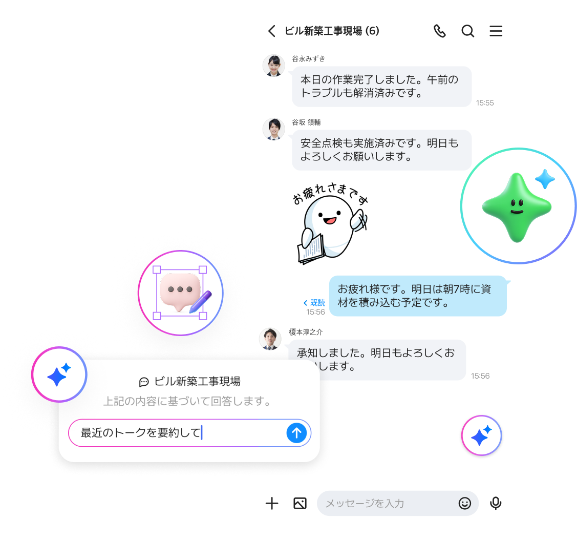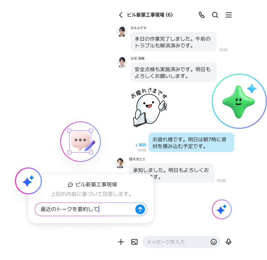 LINE WORKSは、リアルタイムな情報共有や工程管理など、本部と現場の連携を効率化します。