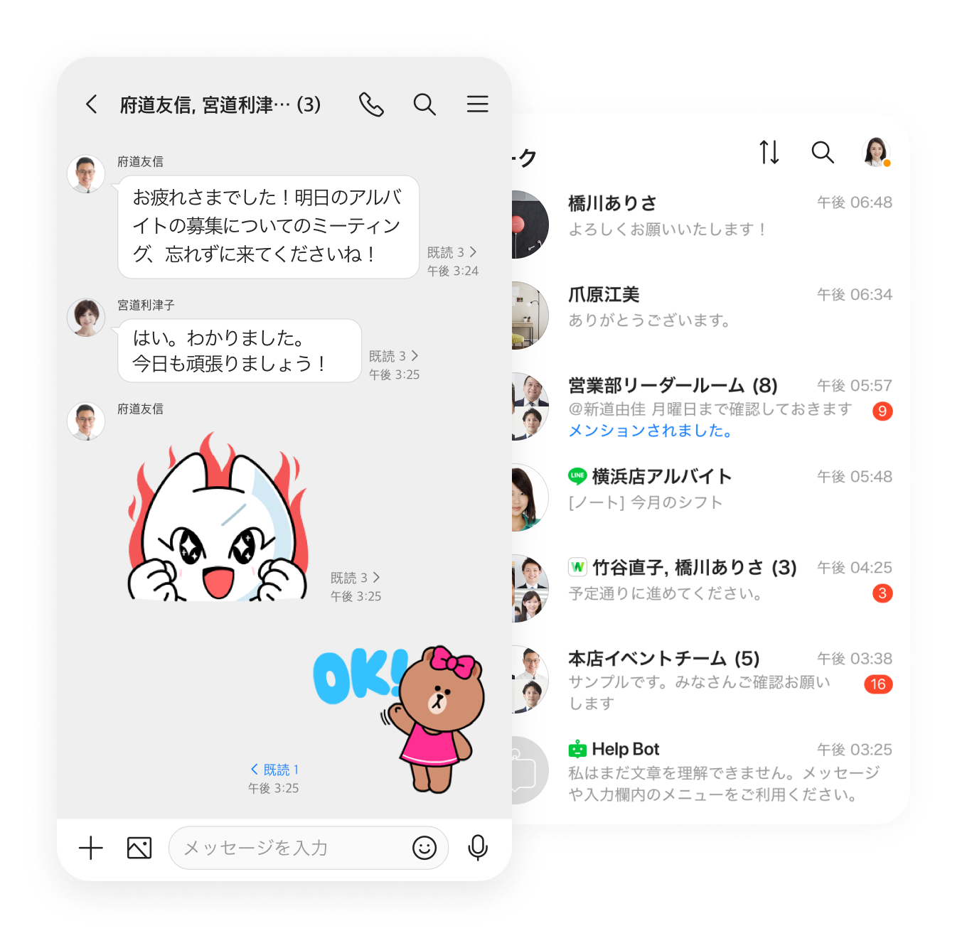 唯一のビジネスチャット LINEのような使い勝手で導入したその日から誰でもすぐに使えます。 おなじみのチャットやスタンプでの楽しい職場づくりはもちろん、 LINEや他社のLINE WORKSユーザーとの連携機能で、