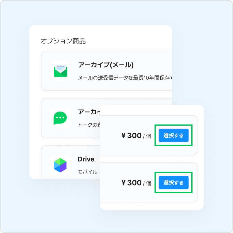 共有ストレージ容量を拡張することで、容量を気にせず各サービスをご利用いただけます。ファイルのやりとりが多く、長期保存が必要な方におすすめです。追加する容量に応じて料金が異なります。