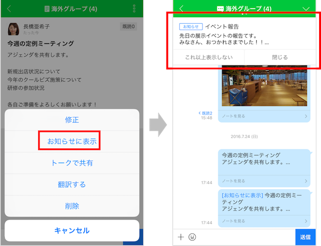 「お知らせに表示」が設定された投稿、トークルーム上部に強調表示されます。