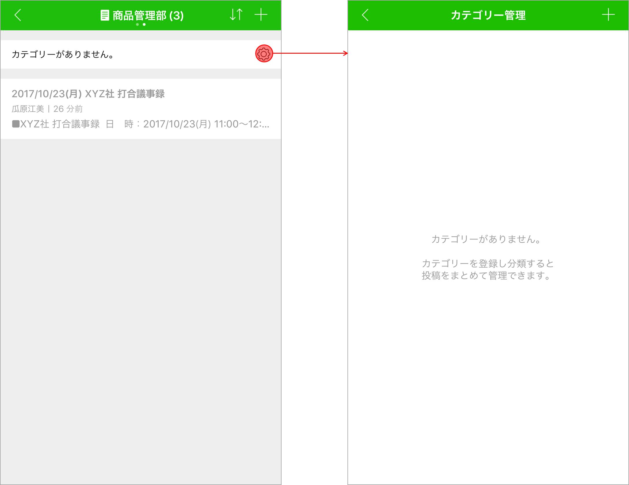 カテゴリーを作成するには、ノート内の設定アイコンからカテゴリー管理画面を開き、右上の[+]をタップします。