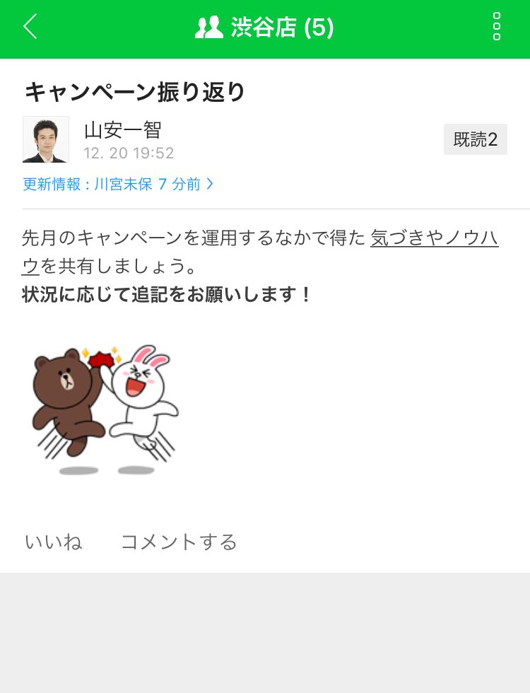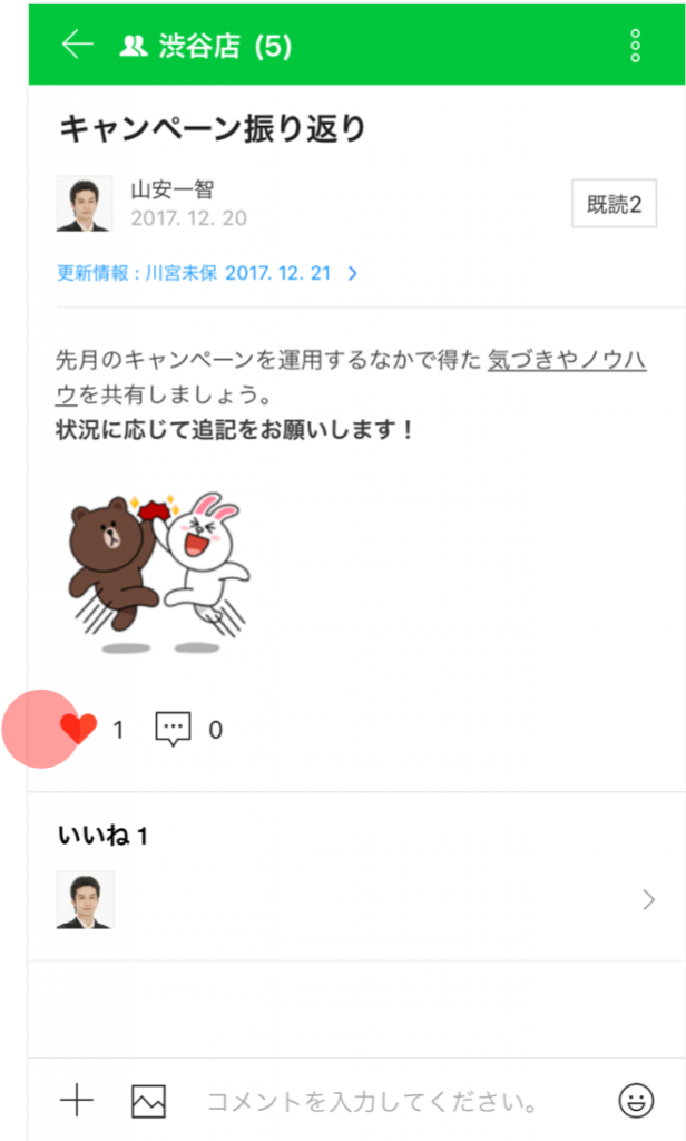 それぞれのノートの投稿に「いいね」をつけたり、コメントをすることができます。もちろんコメントでスタンプを使用することもできます。