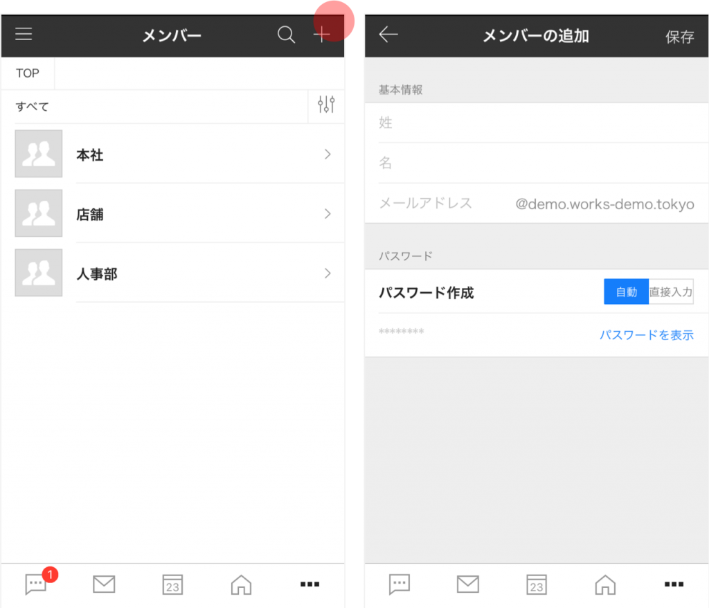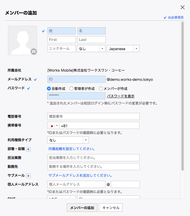 モバイル版アプリのメンバー追加画面には必須項目(姓、名、ID、パスワード)のみ用意されています。より詳しい情報はブラウザ版から登録できます。