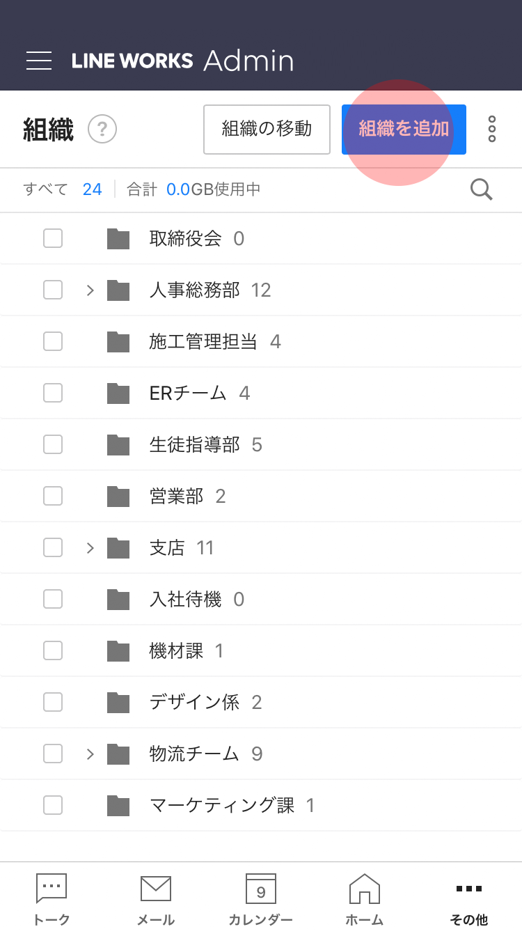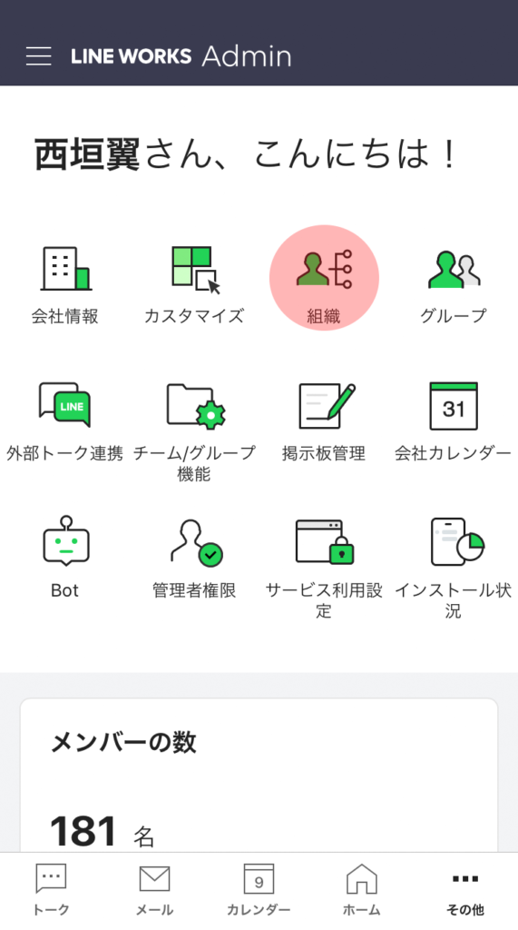 モバイル版アプリの管理者画面で [組織] を選択します。