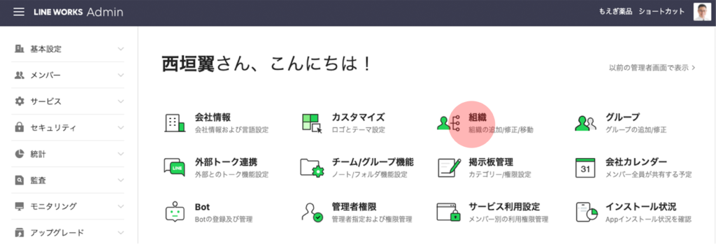 ブラウザ版の管理者画面で [組織] を選択します。