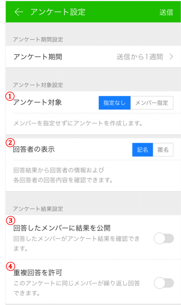 作成したアンケートは、対象メンバーの指定や回答者名の公開といった詳細設定を行ないましょう。