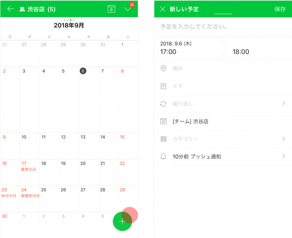 カレンダー画面の右下にある[+]ボタンをタップすると、予定作成画面が開きます。予定の登録、修正、削除時にはトークルームに通知されます。