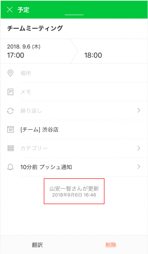 予定の詳細画面を開くと、下部に誰がいつ登録したかの情報が表示されます。