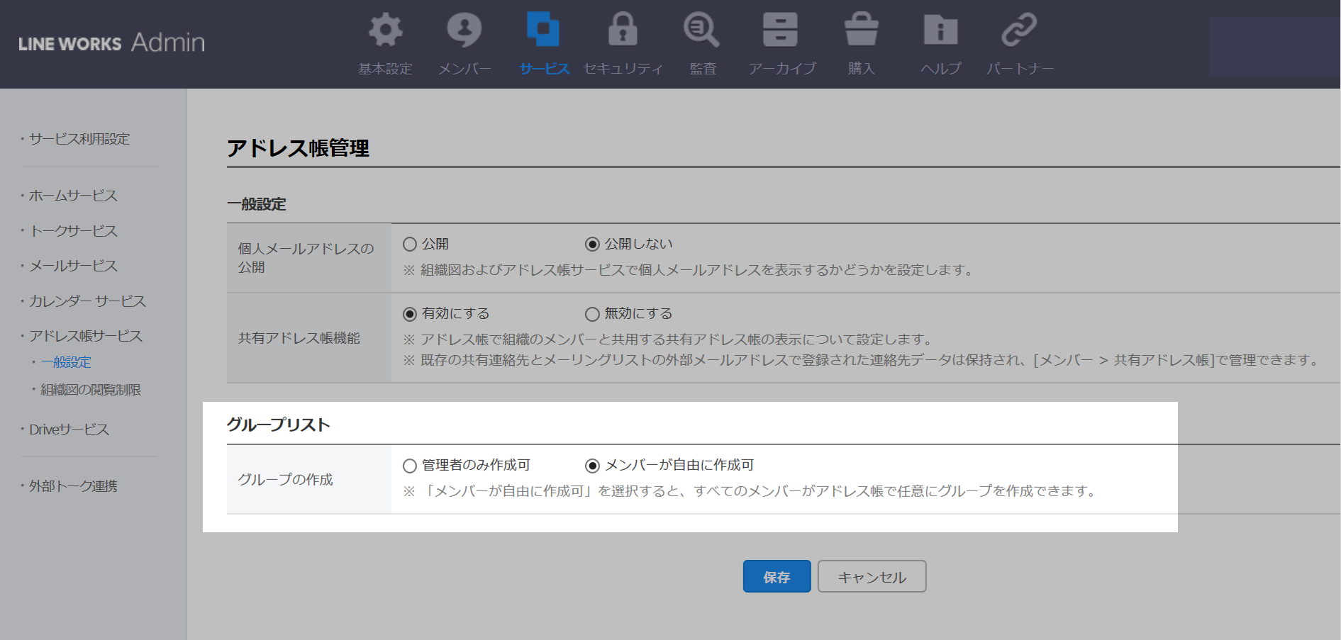 メンバーによるグループ作成は、管理者画面の[サービス] > [アドレス帳] > [グループリスト] でグループの作成に対して「メンバーが自由に作成可」にチェックが入っている場合のみ可能です。メンバーによるグループ作成が許可されている場合のみ、メンバーが自由にグループを作成または修正することができます。