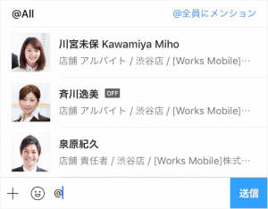 @に続いてメンバー名を入力すると、入力した文字が名前に含まれるメンバーがサジェストされます。”All”と入力すると、トークルーム内のメンバー全員を指定してトークを送信できます。