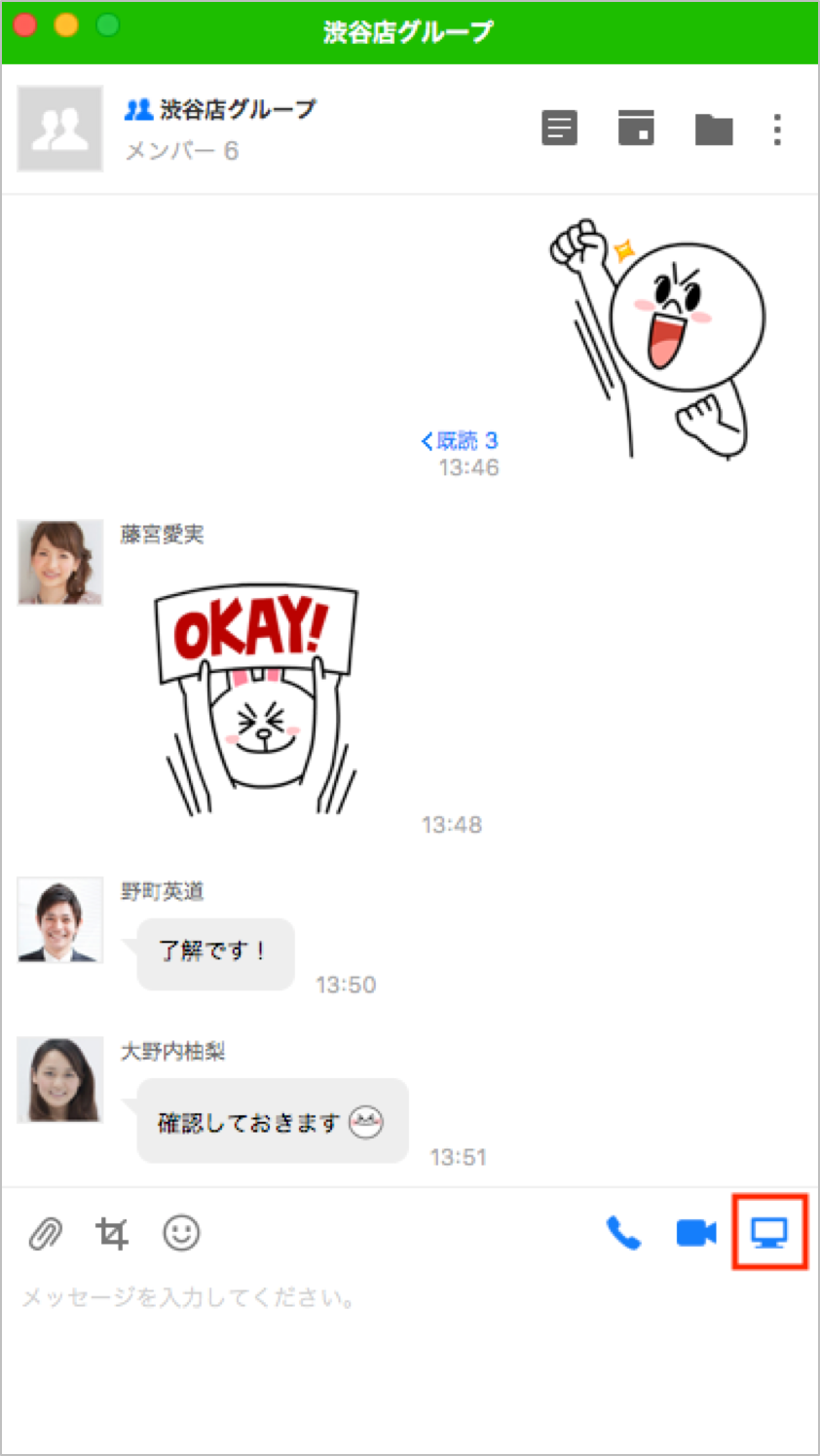 画面共有を開始するには、トーク画面の右下にあるアイコンをクリックし共有する画面を選択してください。