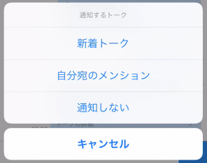 自分にメンションされた場合だけ新着トークを通知するように設定できます。通知設定したいトークルームのメニューを開き、「通知設定」から「自分宛のメンション」を選択します。大人数のトークルームで、自分宛てのトークだけ通知したい場合に便利な機能です。