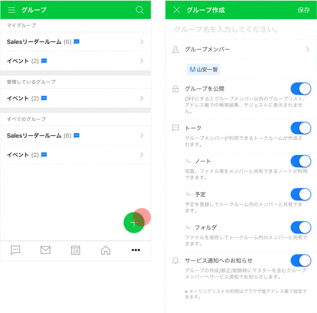 複数人トークルームからグループに昇格させると、トークルームでカレンダーやフォルダなどの機能が使えるようになります。 トークだけでなく、予定を共有したり、ファイルや画像などを共有したい場合にはトークルームをグループに昇格させてみましょう。