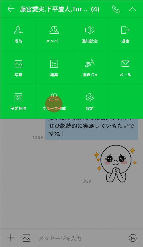 複数人トークルーム内のメニューから [グループ作成] を選択すると、過去のトーク履歴やメンバーを維持したまま、トークルームをそのままグループに昇格させることができます。