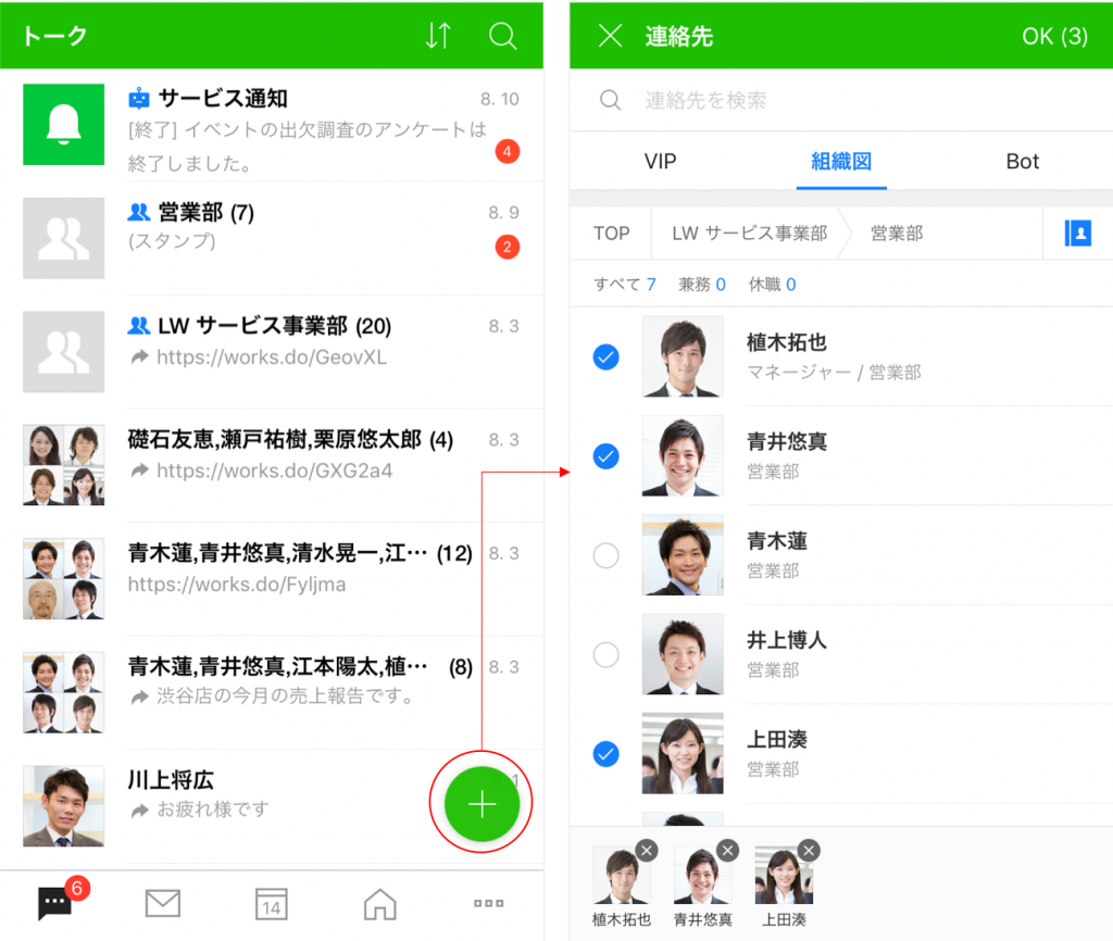 トークルーム一覧で[+]ボタンをタップして連絡先画面を開き、組織図や検索からメンバーを選択してトークを開始できます。