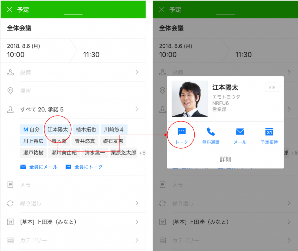 また、カレンダーやホームといった他のサービス内で表示されているメンバーのプロフィールから連絡先を表示し、すぐにトークを開始することもできます。