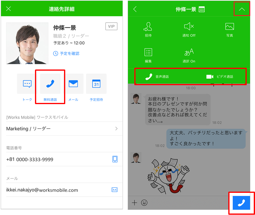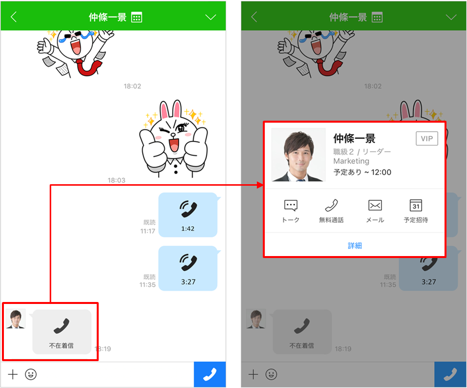 スマホの場合、受話器アイコンが表示されているメッセージをタップすると、電話をかけてきたメンバーのプロフィール情報が表示されて、トークはもちろん、電話発信やメールの送信、予定への招待ができます。