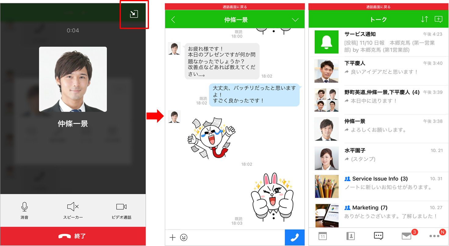 通話中にトーク内容を確認するなど、LINE WORKS のほかの画面を見たいときは、通話画面右上のアイコンをタップします。通話画面が最小化されて、ほかの LINE WORKS サービスを操作できます。通話画面に戻るには画面上部の[通話画面に戻る]をタップします。