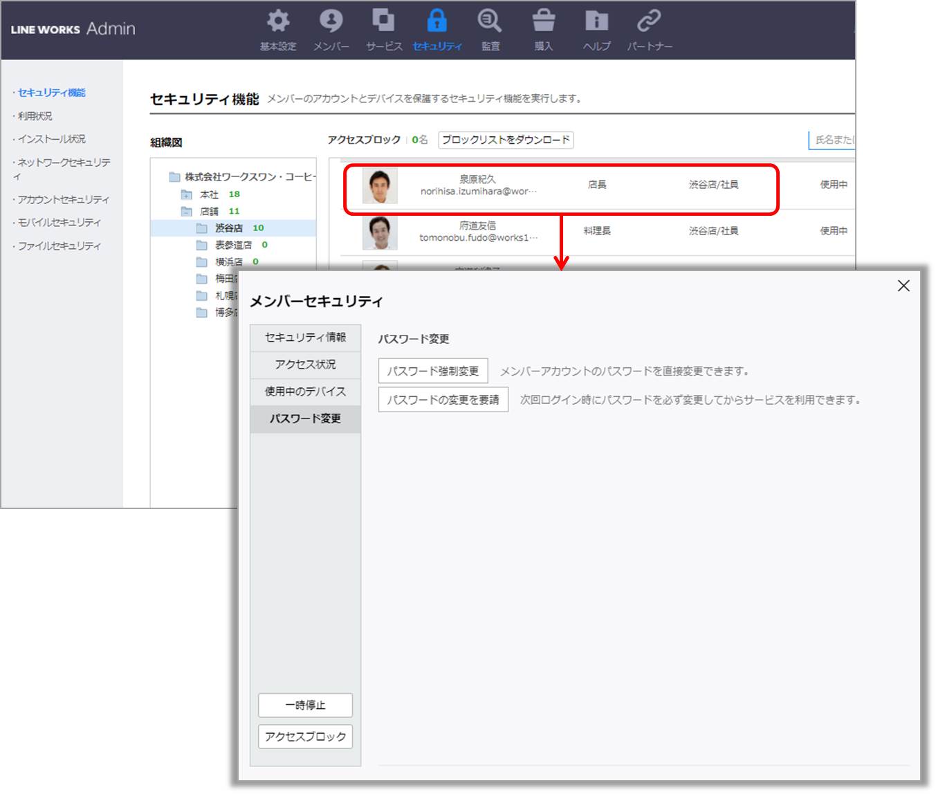 LINE WORKSではサービスを安心して利用するために、メンバーに安全性の高いログインパスワードを設定させたり、管理者がメンバーのログインパスワードを強制的に変更することができます。