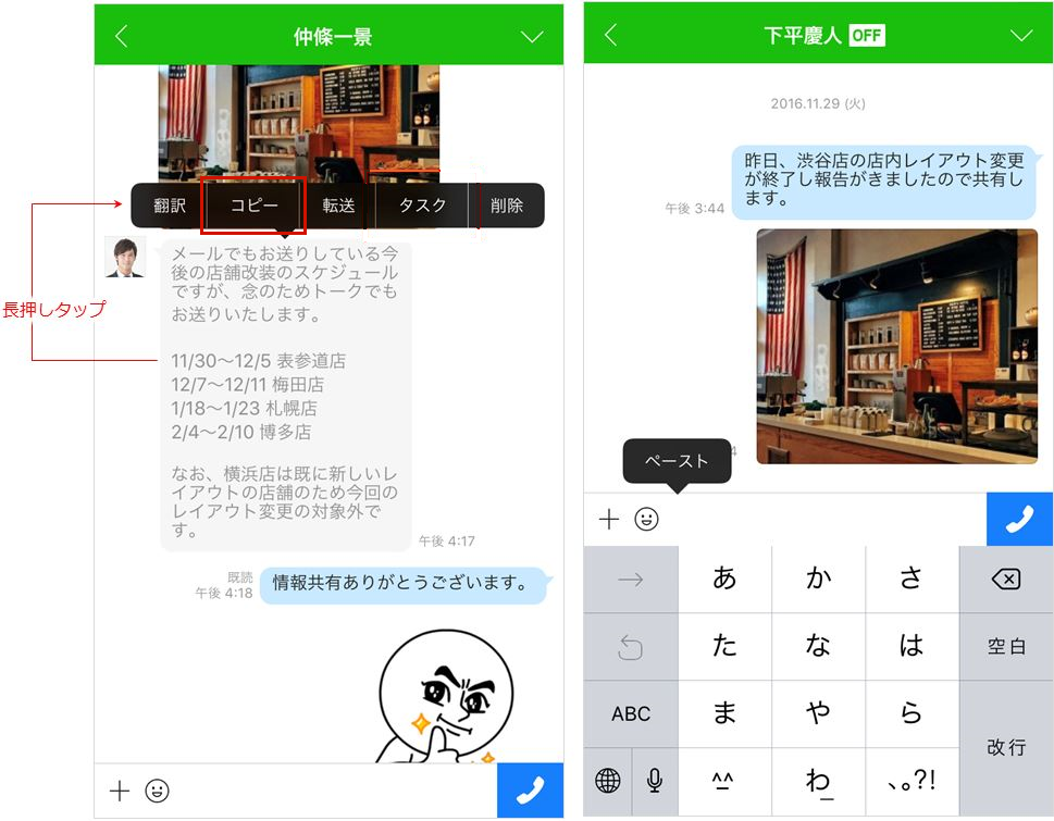 LINE WORKSでは、メッセージ全体をワンステップでコピーすることができます。長文のメッセージを編集して転送する際、ドラッグして選択しなくても、メッセージを長押しすることでコピーができます。