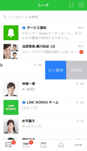 トークルーム一覧で任意のトークルームを左にスワイプし、[ピン留め]を押すことでトークルームの上位に表示させることができます。