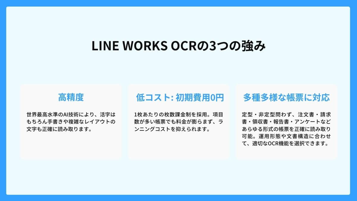 LINE WORKS OCRが多くの企業に選ばれる理由は、3つあります。認識精度の高さ、対応できる帳票の幅広さ、そして初期費用0円から利用できる低コストです。