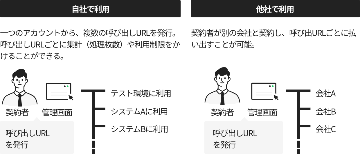 デバイス毎、利用者毎、提供先毎などに呼び出しURLの発行ができ、