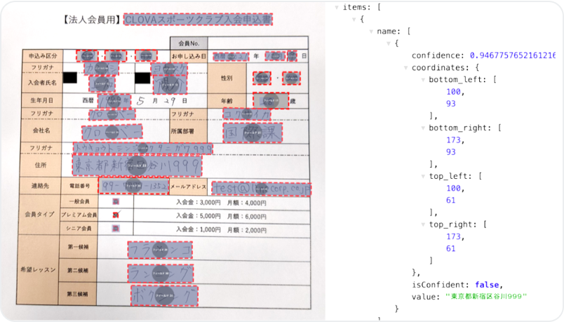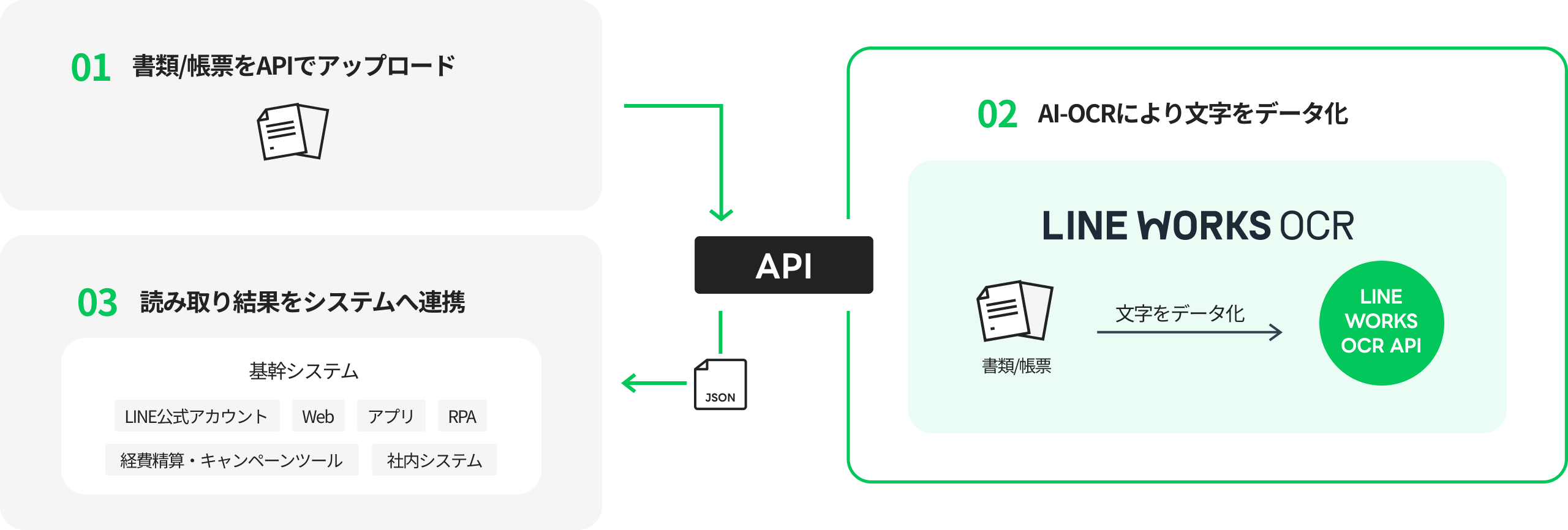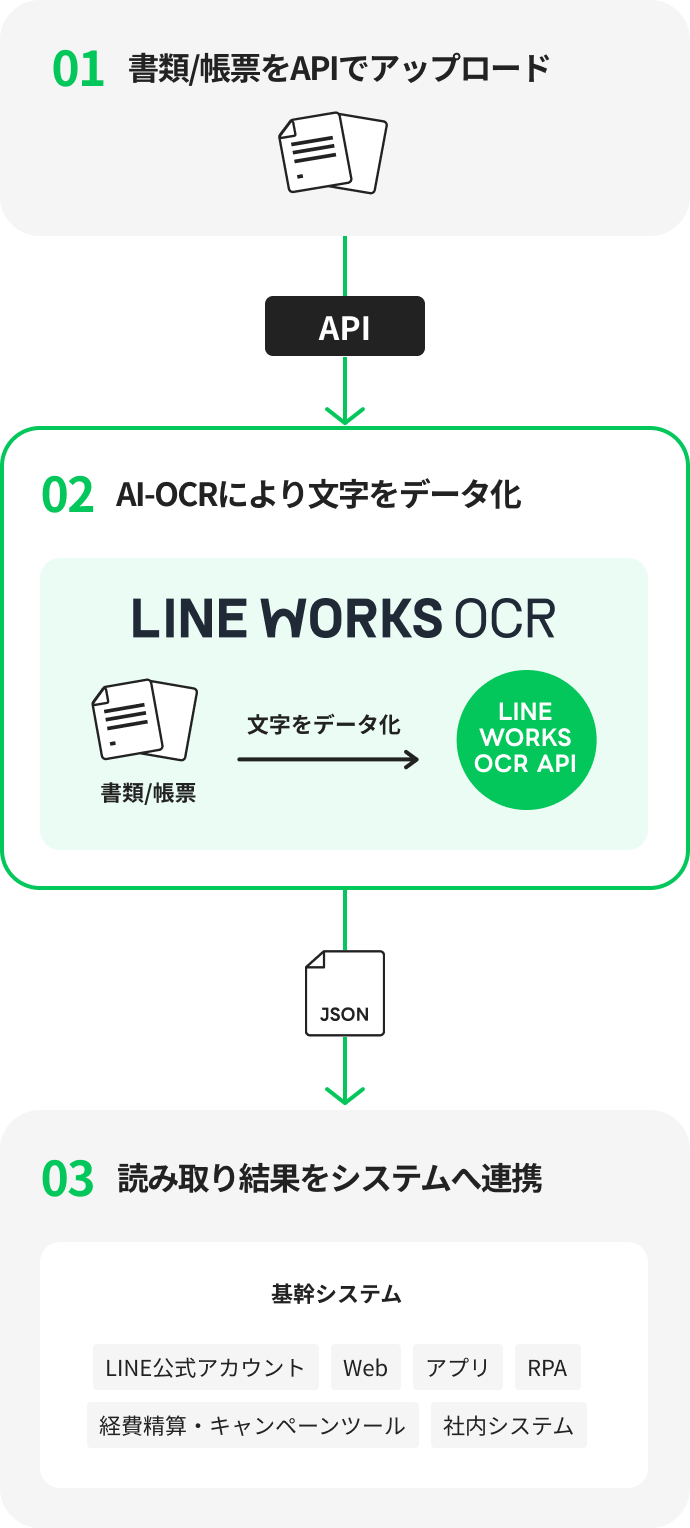 書類や帳票の画像をLINE WORKS OCR APIへアップロードすると、LINE WORKS OCRによって読み取られた結果(テキストデータ)がJSONで返却されます。