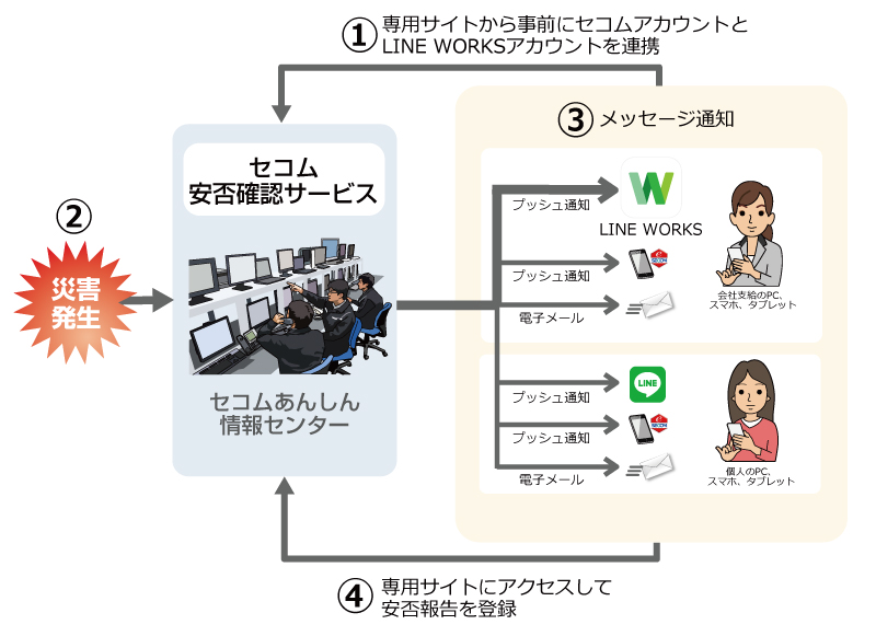 仕事用のLINE「LINE WORKS」を提供するワークスモバイルジャパン株式会社(本社:東京都渋谷区、代表取締役社長:石黒豊、以下「ワークスモバイルジャパン」)は、セコム株式会社(本社:東京都渋谷区、社長:尾関 一郎、以下「セコム」)のグループ会社でBPO・ICT事業を担うセコムトラストシステムズ株式会社(本社:東京都渋谷区、社長:林 慶司、以下「STS社」)が提供する「セコム安否確認サービス」と「LINE WORKS」が連携したことをお知らせいたします。これにより、「セコム安否確認サービス」から配信される安否確認プッシュ通知(安否報告依頼や緊急連絡通知)を「LINE WORKS」で受け取ることが可能になります。