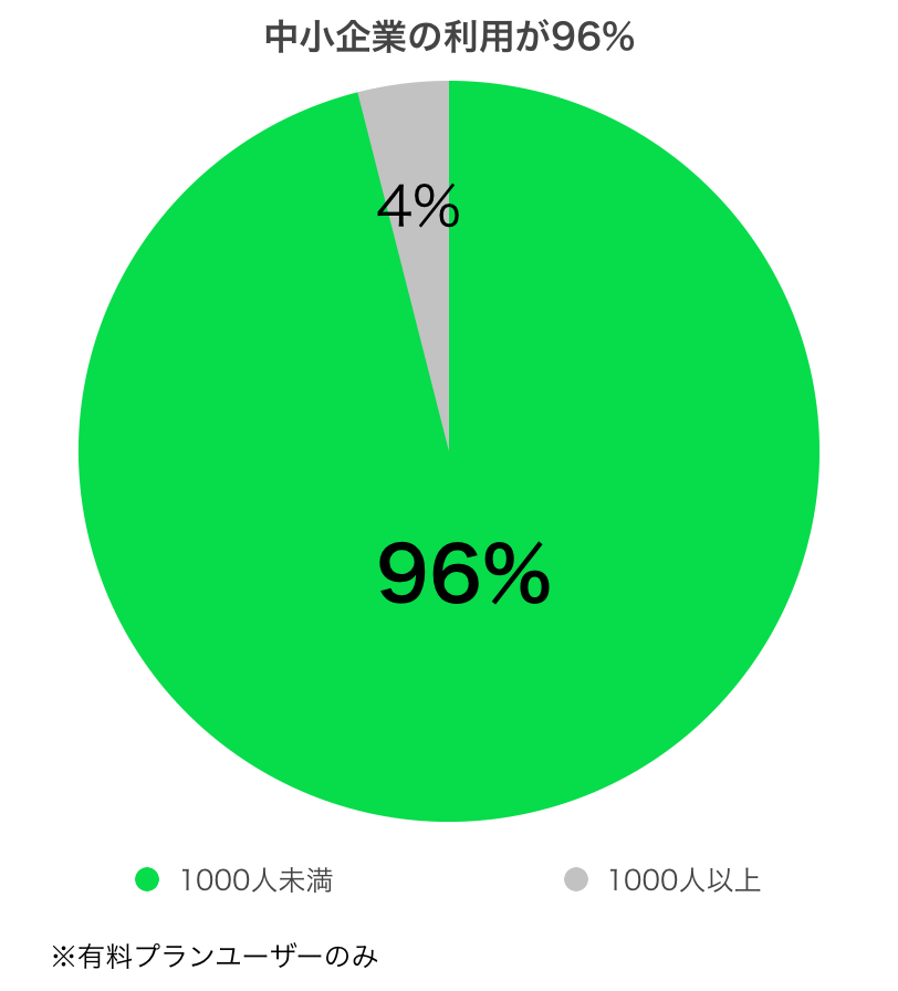 「LINE WORKS」は中小企業での利用が多いことも特長の一つです。「LINE WORKS」の有料版を利用している企業のうち、96%が中小企業であり、75%が100人未満の企業です。「LINE WORKS」の利用が大手企業以外にも広がっています。