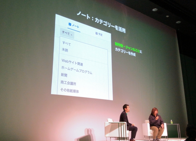 特徴的なのは、LINE WORKSの「ノート」機能を掲示板のようにご活用されている点。制作物・ジャンルごとに「カテゴリー」を作成し、ノートにコメントを付加することで、各案件に関する社内外のやりとりを行っているそうです。