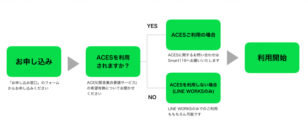 ※2:「ACES」の無償提供期間は6月25日までを予定しております。また、ACESをご利用の場合LINE WORKSのテナント提供会社は株式会社Smart119となります。