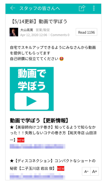 4月の緊急事態宣言を受けて全店を休業し、約200名の新入社員をはじめとする、若手社員(美容師)への教育をオンライン化しました。社内でも特に技術力の高い美容師がシャンプーやヘアカットなどの教材動画を撮影し、「LINE WORKS」の「掲示板」で共有。動画を視聴した新人・若手社員も実演動画をアップロードし、アドバイスを受けながら技術を磨いています。なお、休業期間における動画の総再生時間は約1,000時間を超えました。